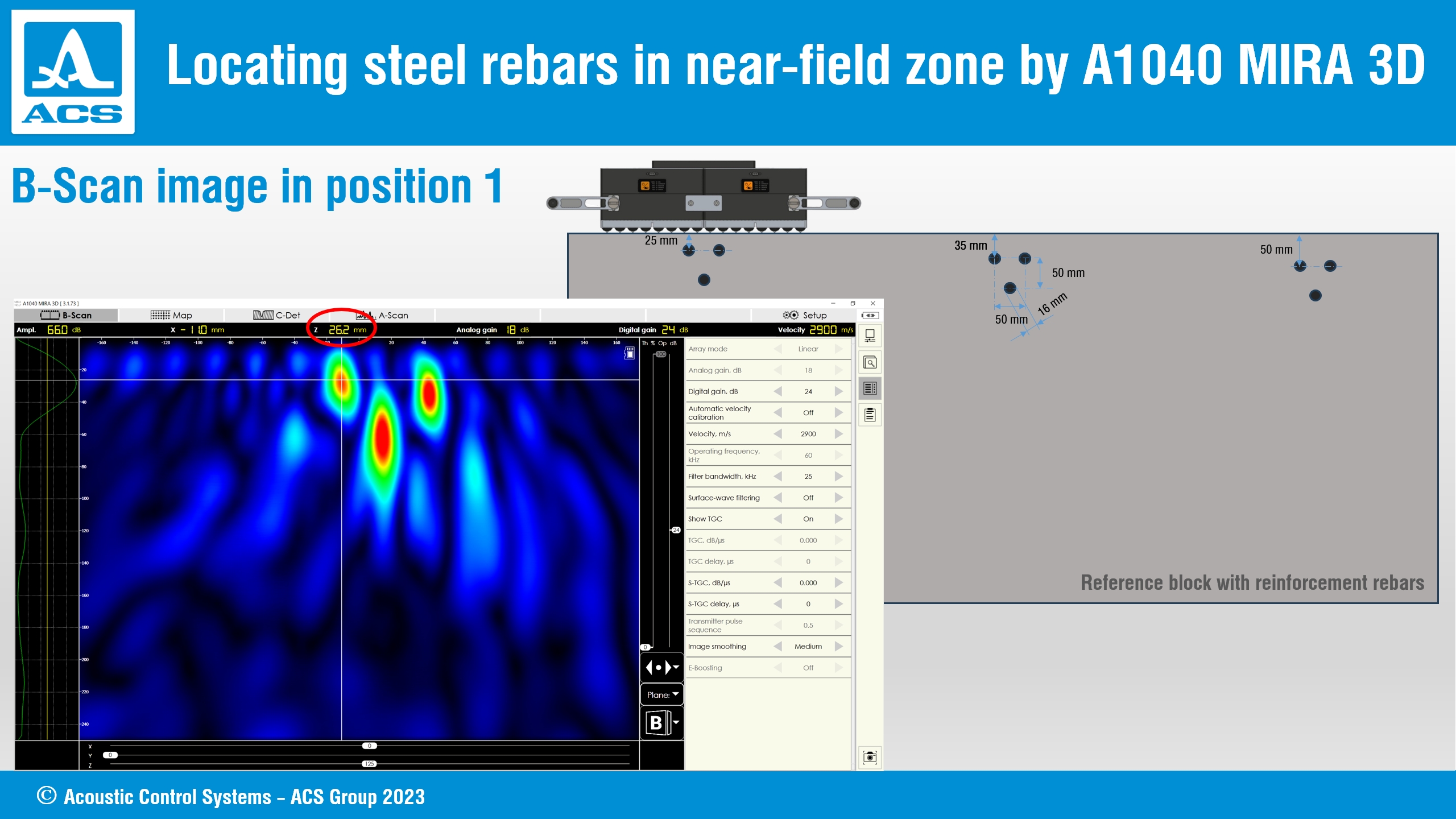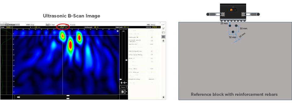 The image below represents detecting steel rebar of ∅16 mm at 17 mm depth (25 mm to the center of rebar).